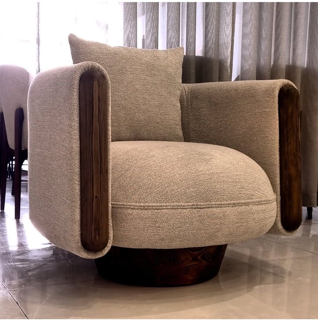 پوشش پارچهای مبل راحتی با کیفیت بالا انتخاب شده است؛ در عین داشتن بافت لطیف، مقاومت کافی در برابر سایش و استفاده روزانه را دارد. همچنین امکان تغییر رنگ پارچه و چوب به انتخاب مشتری وجود دارد که نقطه قوت بزرگ برای تطبیق با دکور خانه است. دوخت تمیز و توجه به جزئیات در نقاط اتصال و لبهها نشاندهندهی دقت تولیدکننده است.